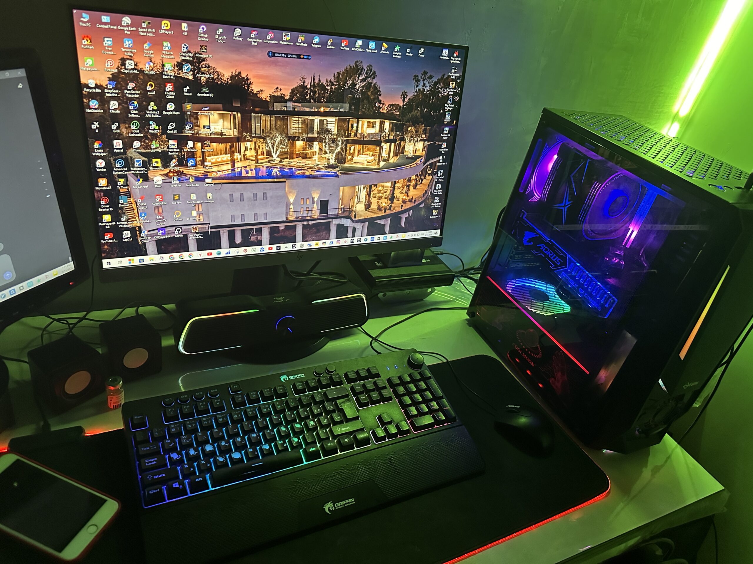 یک ست کامل و حرفهای شامل کیس قدرتمند، نورپردازی جذاب و دو مانیتور سالم، مناسب برای استفاده حرفهای، طراحی، ادیت، ترید، برنامهنویسی و گیمینگ.
